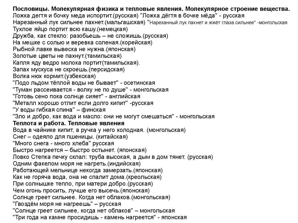 поговорки, касающиеся тепловых явлений и молекулярной физики. Во