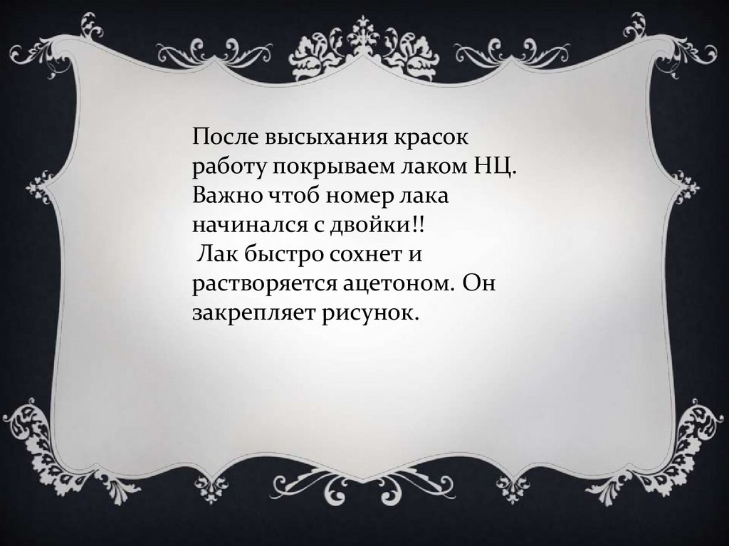 После высыхания красокработу покрываем лаком НЦ.
