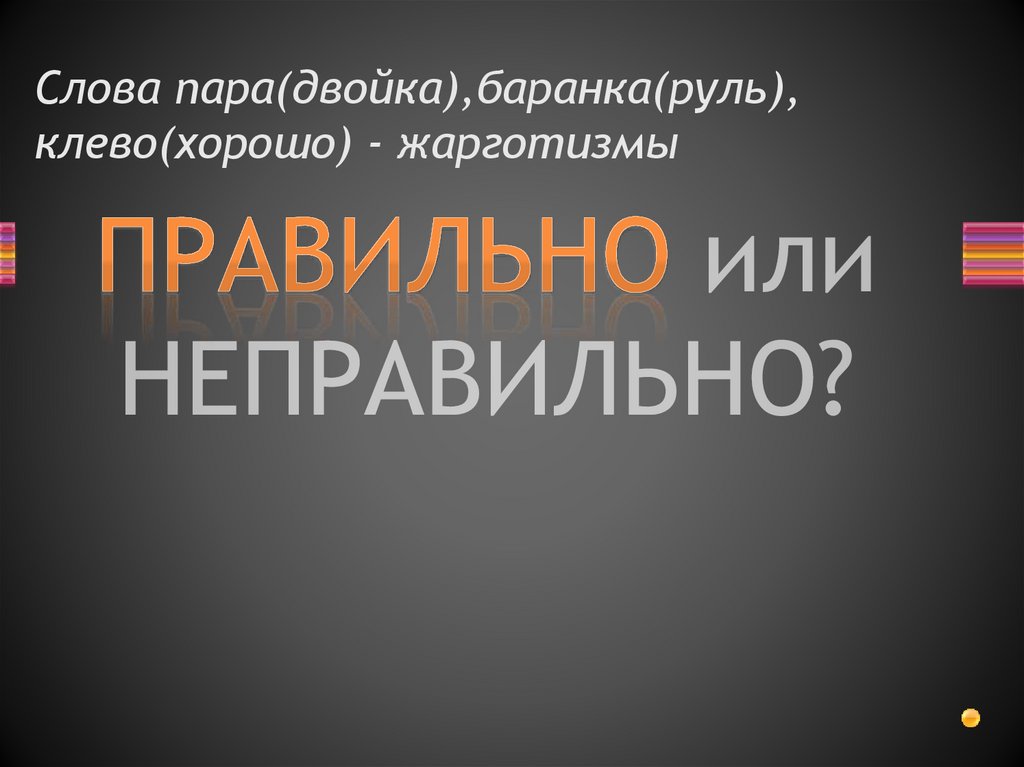 Слова пара(двойка),баранка(руль),клево(хорошо) - жарготизмы