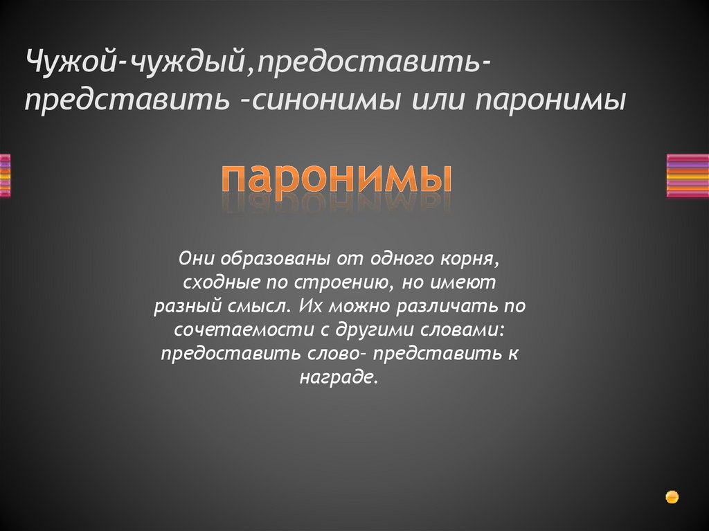 Чужой-чуждый,предоставитьпредставить –синонимы или паронимыОни образованы от одного корня,