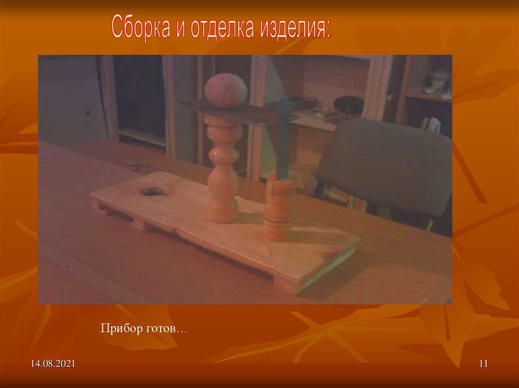 5. Прибор состоит из нескольких деталей: На плоском фанерном основании установлены две деревянных стойки. В левой закреплена