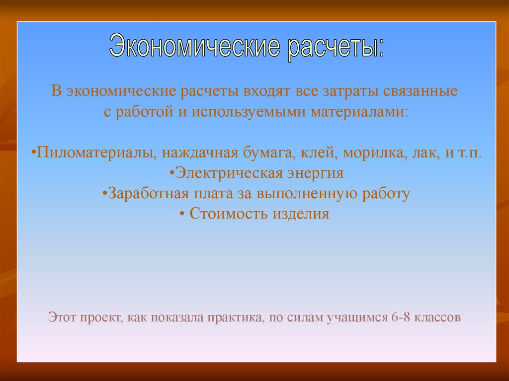 В экономические расчеты входят все затраты связанныес работой и используемыми материалами: