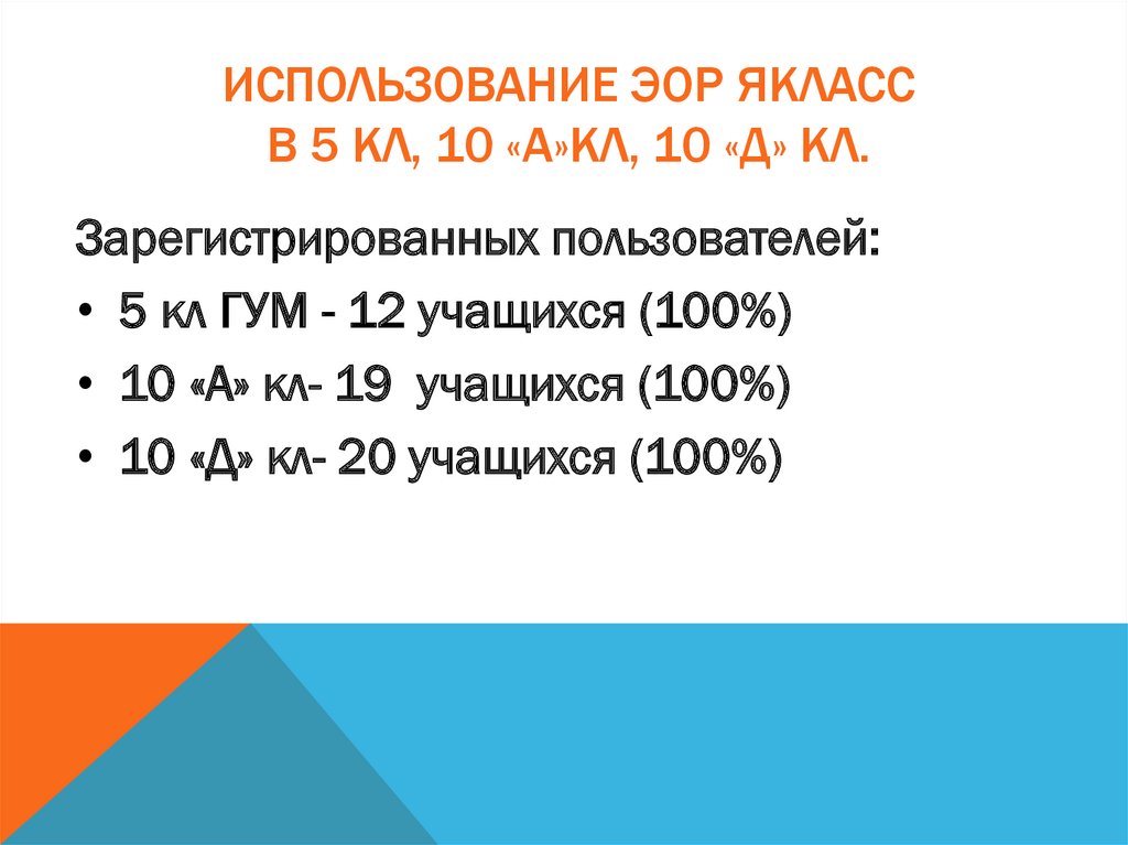 ИСПОЛЬЗОВАНИЕ ЭОР ЯКЛАССВ 5 КЛ, 10 «А»КЛ, 10 «Д» КЛ.