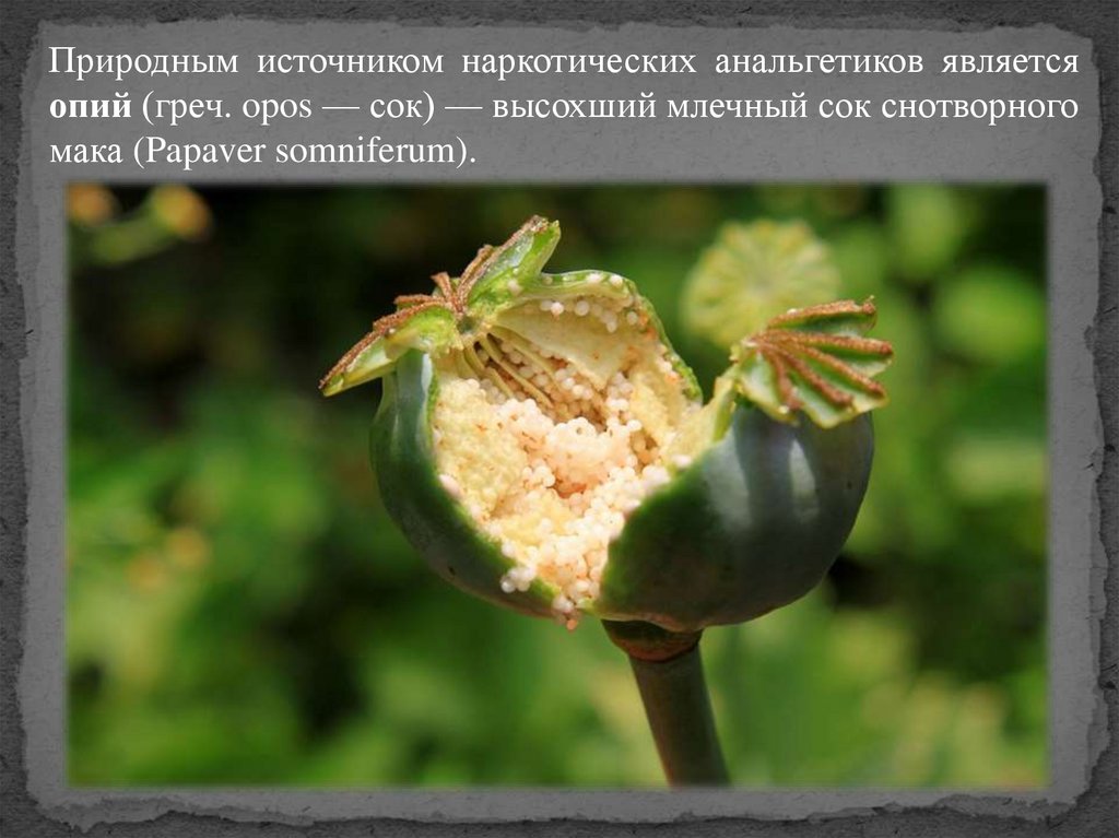Природным источником наркотических анальгетиков являетсяопий (греч. opos — сок) — высохший млечный сок снотворного