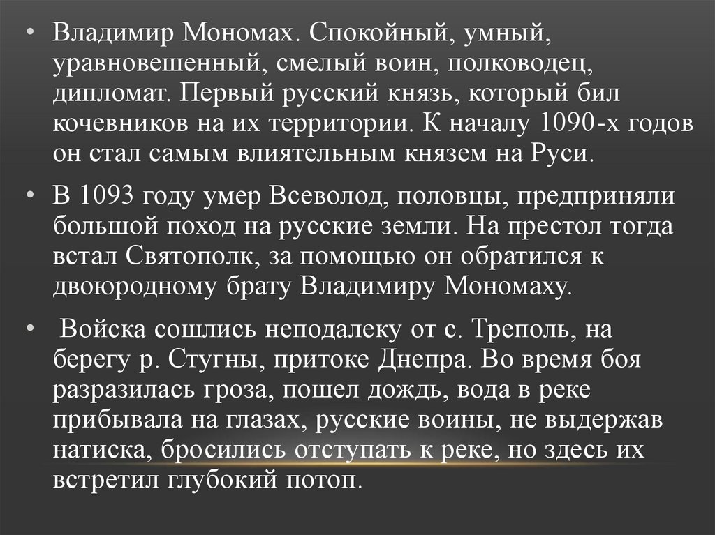 • Владимир Мономах. Спокойный, умный,уравновешенный, смелый воин, полководец,