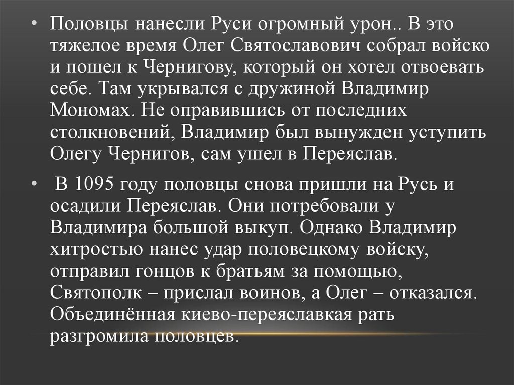• Половцы нанесли Руси огромный урон.. В этотяжелое время Олег Святославович собрал войско