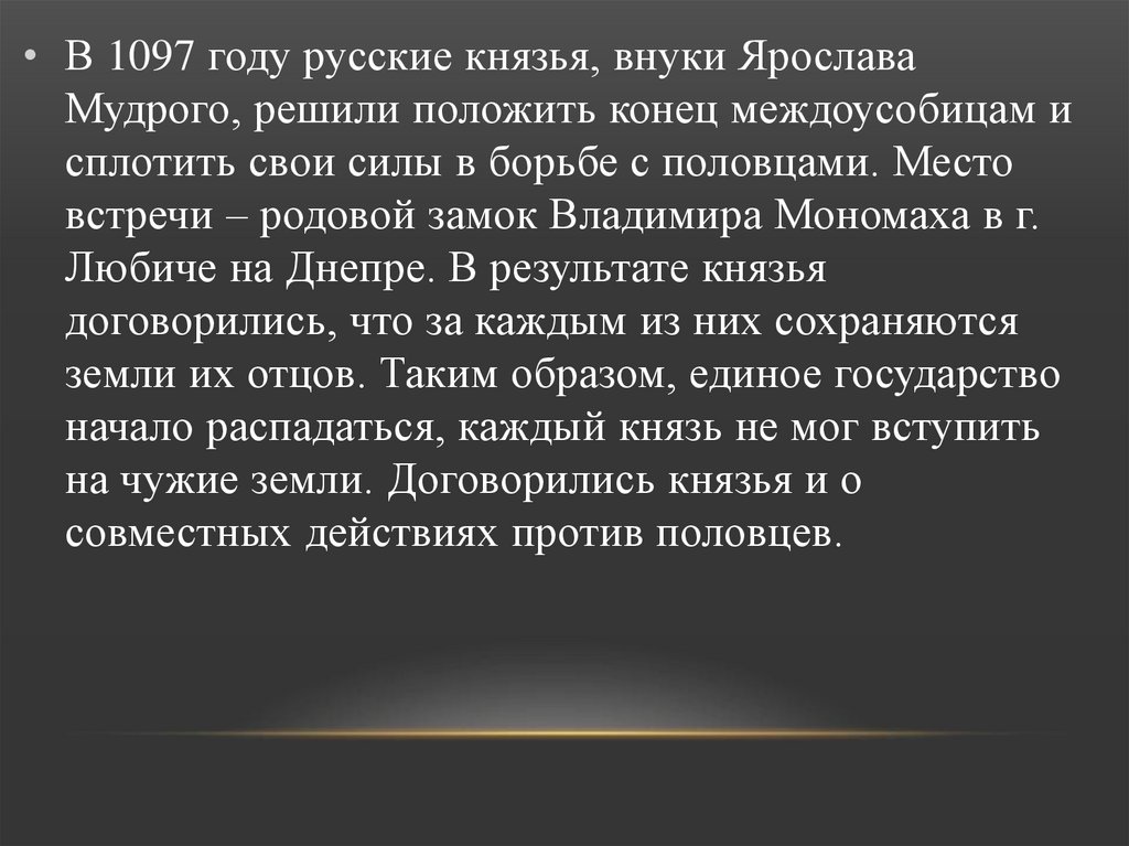• В 1097 году русские князья, внуки ЯрославаМудрого, решили положить конец междоусобицам и
