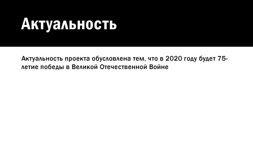 АктуальностьАктуальность проекта обусловлена тем, что в 2020 году будет 75летие победы в Великой Отечественной Войне