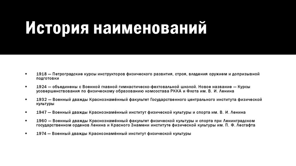 История наименований1918 — Петроградские курсы инструкторов физического развития, строя, владения оружием и допризывной