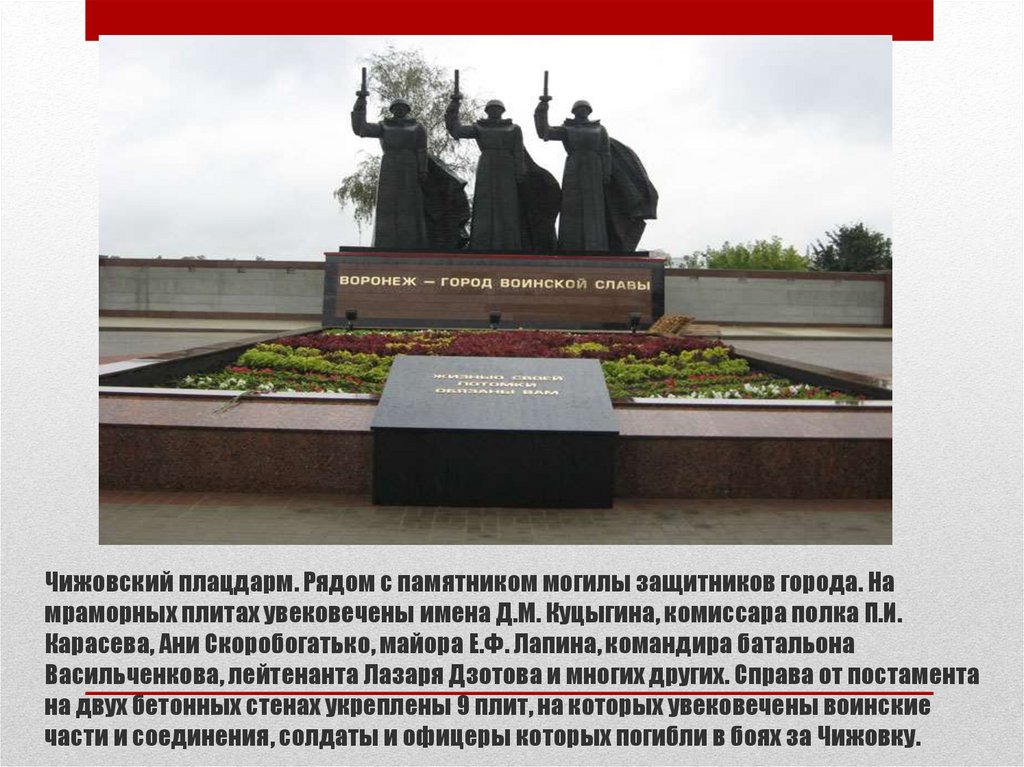 Чижовский плацдарм. Рядом с памятником могилы защитников города. Намраморных плитах увековечены имена Д.М. Куцыгина, комиссара полка П.И.
