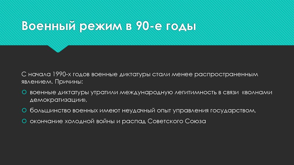 Военный режим в 90-е годыС начала 1990-х годов военные диктатуры стали менее распространенным