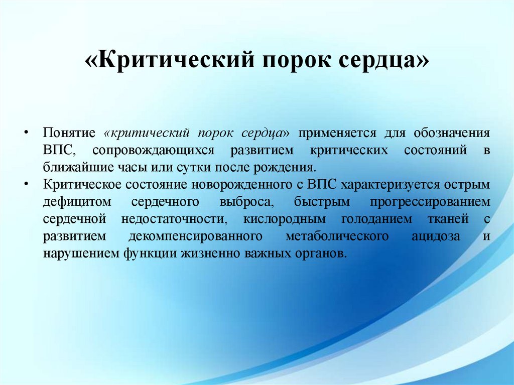 «Критический порок сердца»• Понятие «критический порок сердца» применяется для обозначения