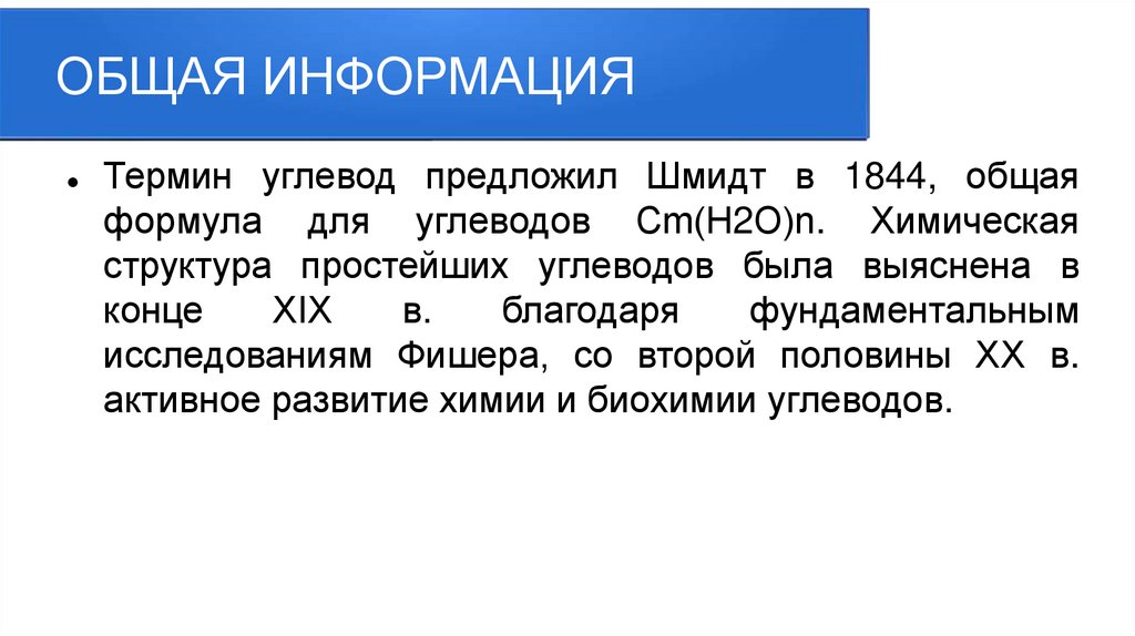 ОБЩАЯ ИНФОРМАЦИЯТермин углевод предложил Шмидт в 1844, общая