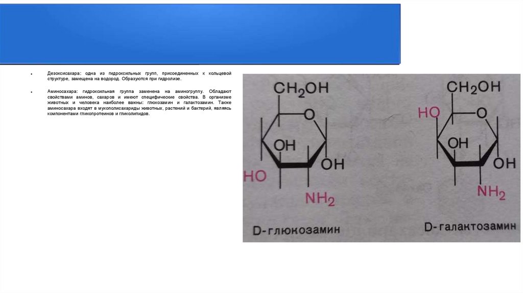 Дезоксисахара: одна из гидроксильных групп, присоединенных к кольцевойструктуре, замещена на водород. Образуются при гидролизе.
