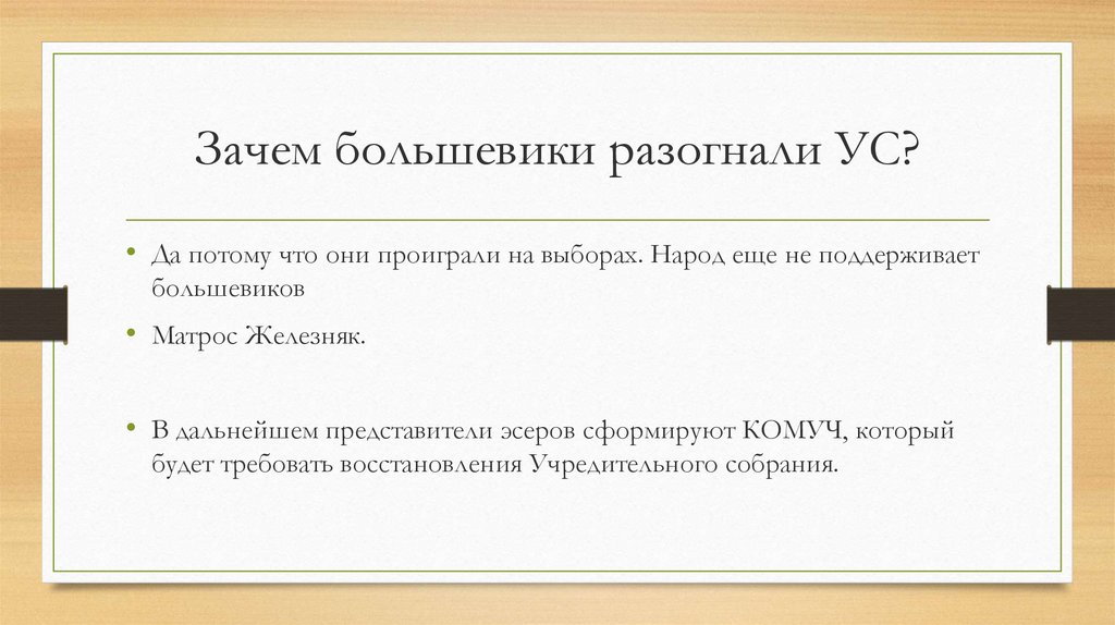 Зачем большевики разогнали УС?• Да потому что они проиграли на выборах. Народ еще не поддерживает