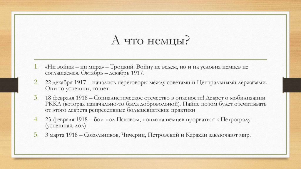 А что немцы?1. «Ни войны – ни мира» – Троцкий. Войну не ведем, но и на условия немцев не