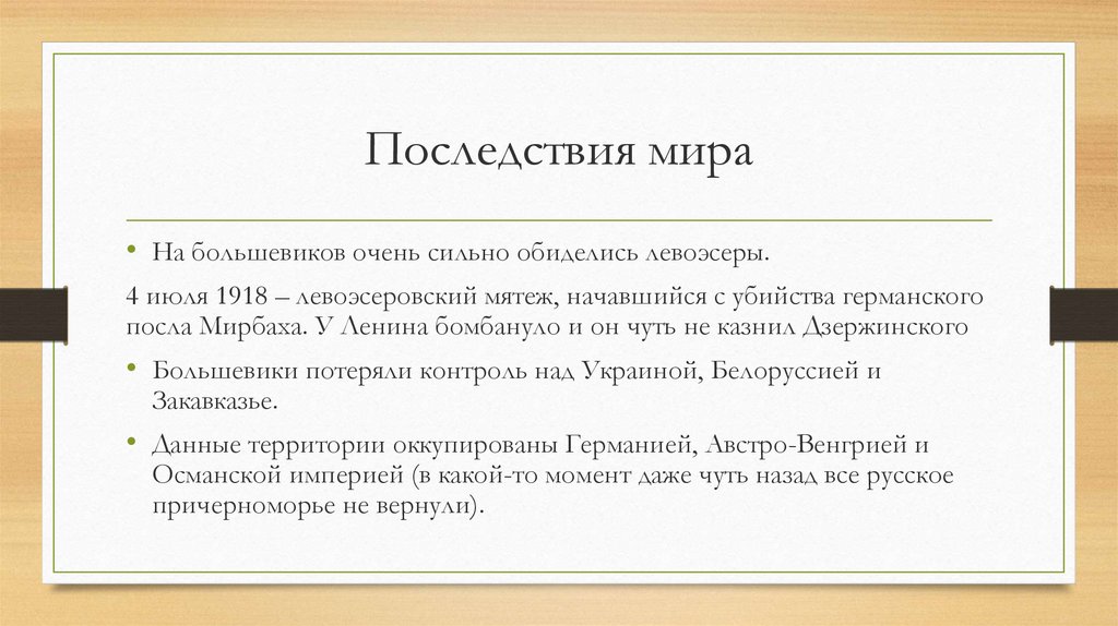 Последствия мира• На большевиков очень сильно обиделись левоэсеры.