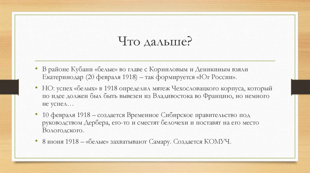 Что дальше?• В районе Кубани «белые» во главе с Корниловым и Деникиным взяли