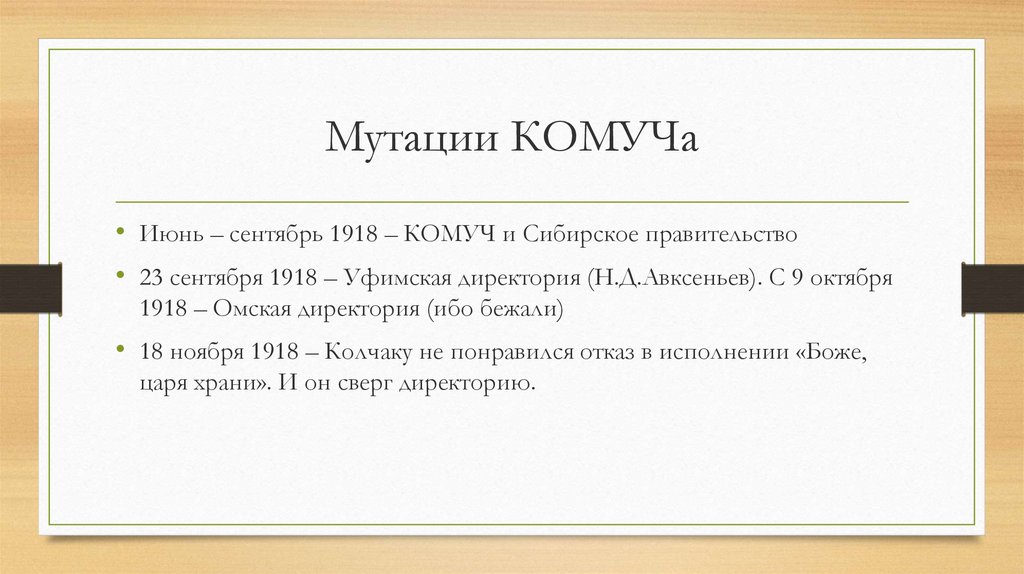Мутации КОМУЧа• Июнь – сентябрь 1918 – КОМУЧ и Сибирское правительство