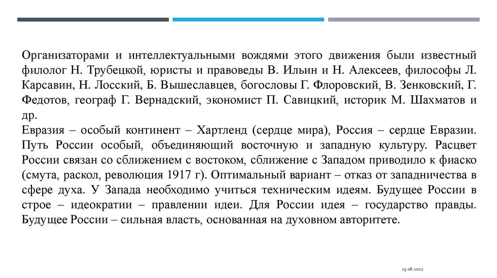 Организаторами и интеллектуальными вождями этого движения были известныйфилолог Н. Трубецкой, юристы и правоведы В. Ильин и Н. Алексеев, философы Л.