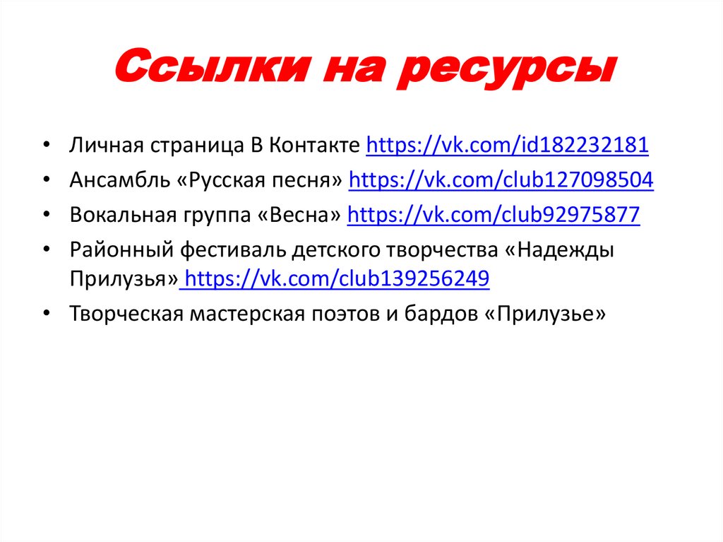Ссылки на ресурсыЛичная страница В Контакте https://vk.com/id182232181