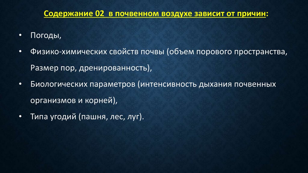 Содержание 02 в почвенном воздухе зависит от причин:• Погоды,