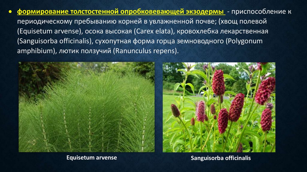 формирование толстостенной опробковевающей экзодермы - приспособление кпериодическому пребыванию корней в увлажненной почве; (хвощ полевой