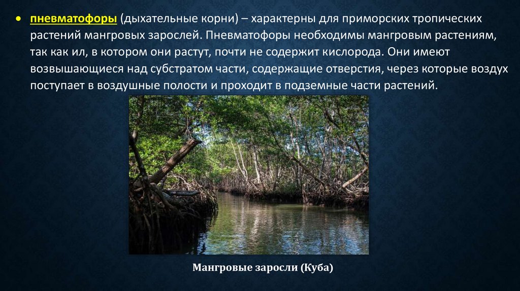 пневматофоры (дыхательные корни) – характерны для приморских тропическихрастений мангровых зарослей. Пневматофоры необходимы мангровым растениям,