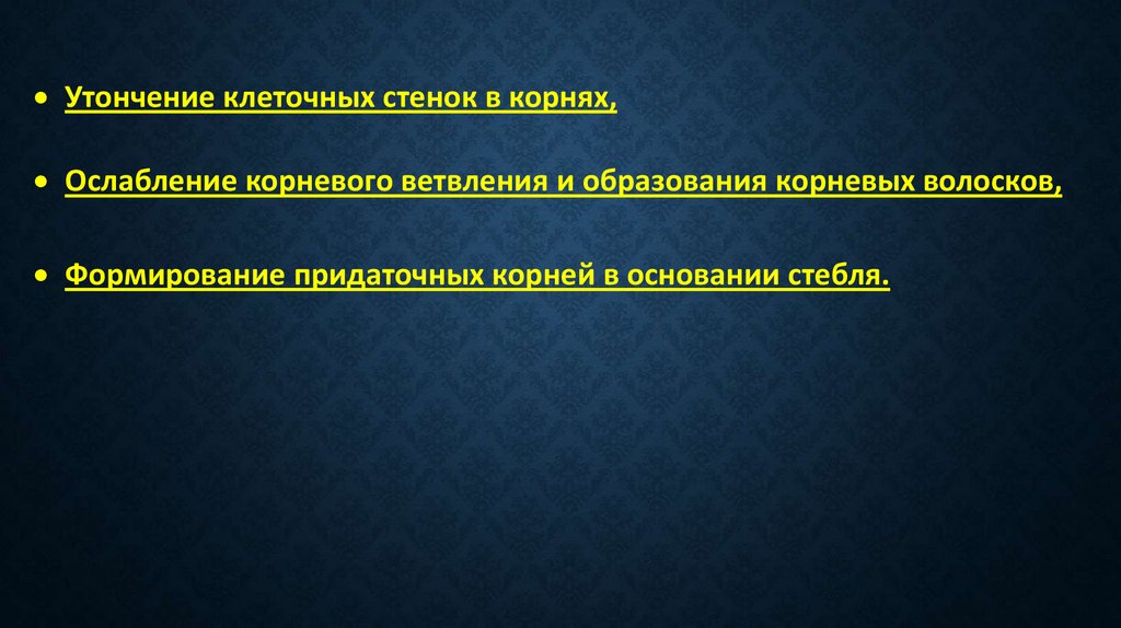 Утончение клеточных стенок в корнях,Ослабление корневого ветвления и образования корневых волосков,
