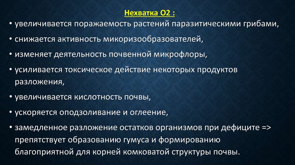 Нехватка О2 :• увеличивается поражаемость растений паразитическими грибами,