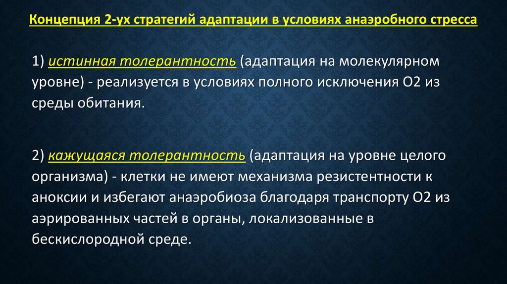 Концепция 2-ух стратегий адаптации в условиях анаэробного стресса1) истинная толерантность (адаптация на молекулярном