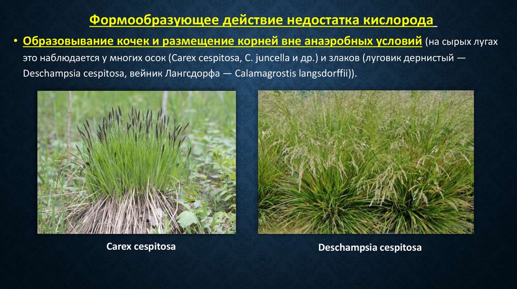 Формообразующее действие недостатка кислорода• Образовывание кочек и размещение корней вне анаэробных условий (на сырых лугах