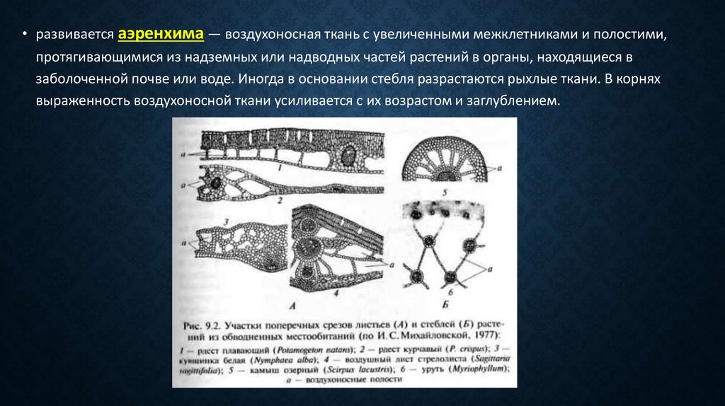 • развивается аэренхима — воздухоносная ткань с увеличенными межклетниками и полостими,протягивающимися из надземных или надводных частей растений в органы, находящиеся в