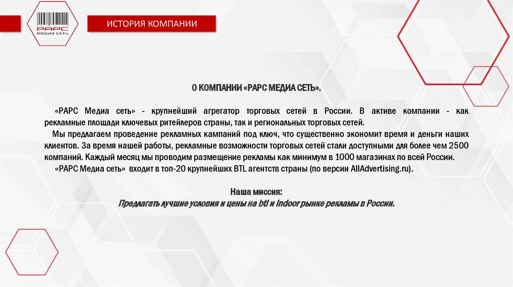 «РАРС Медиа сеть» - крупнейший агрегатор торговых сетей в России. В активе компании - как