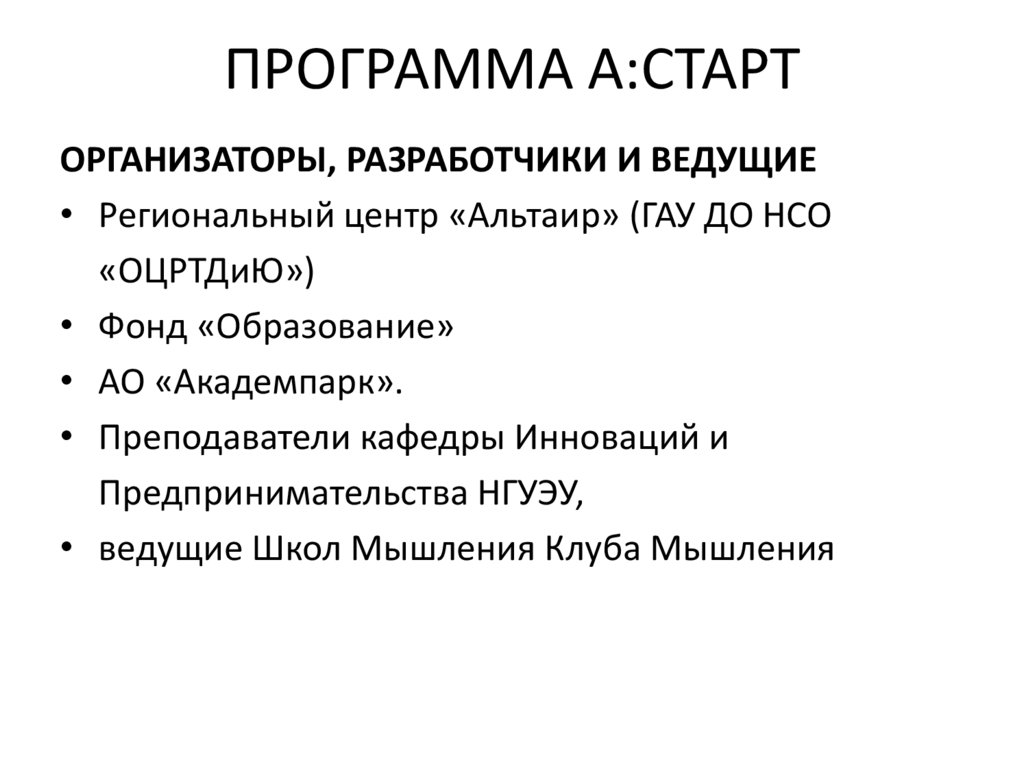 ПРОГРАММА А:СТАРТОРГАНИЗАТОРЫ, РАЗРАБОТЧИКИ И ВЕДУЩИЕ