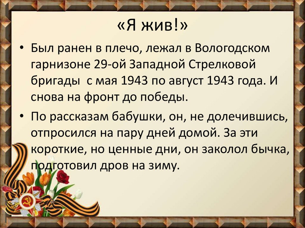 «Я жив!»• Был ранен в плечо, лежал в Вологодском