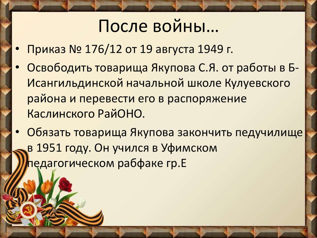 После войны…• Приказ № 176/12 от 19 августа 1949 г.