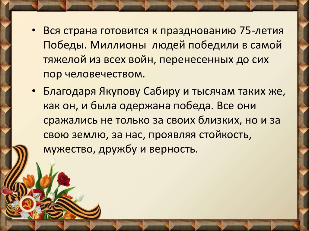 • Вся страна готовится к празднованию 75-летияПобеды. Миллионы людей победили в самой