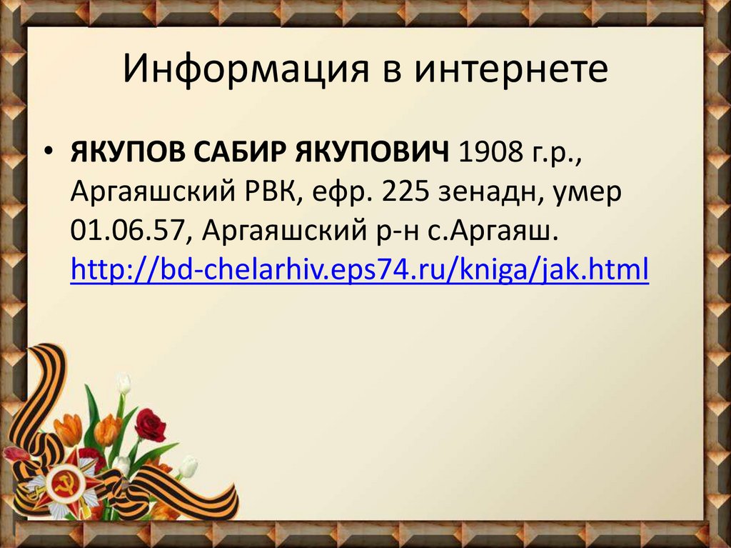 Информация в интернете• ЯКУПОВ САБИР ЯКУПОВИЧ 1908 г.р.,