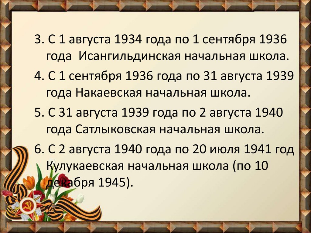 3. С 1 августа 1934 года по 1 сентября 1936года Исангильдинская начальная школа.
