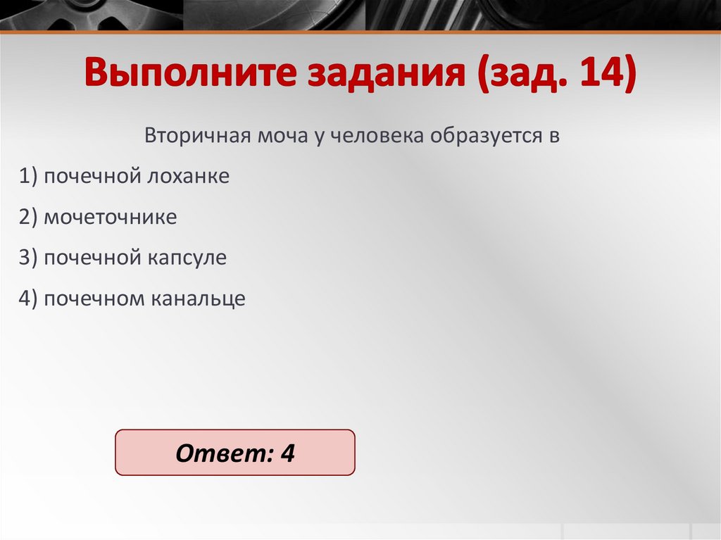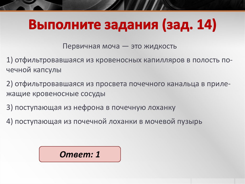Вторичная моча у человека образуется в1) почечной лоханке
