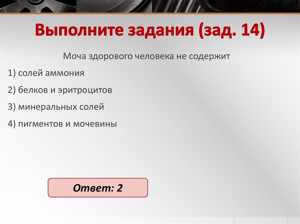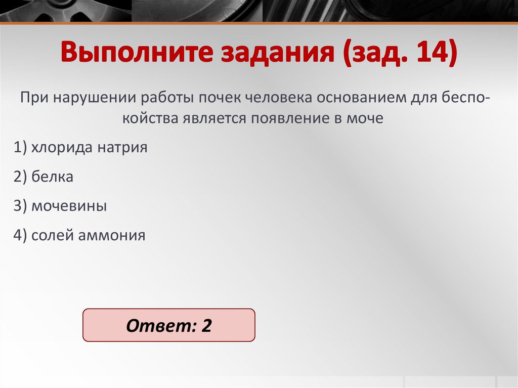 При нарушении работы почек человека основанием для беспокойства является появление в моче1) хлорида натрия