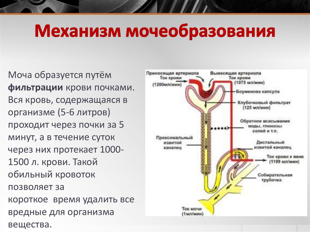 Моча образуется путёмфильтрации крови почками.