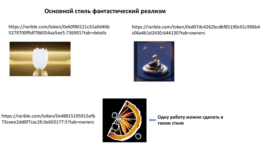 Основной стиль фантастический реализмhttps://rarible.com/token/0x60f80121c31a0d46b