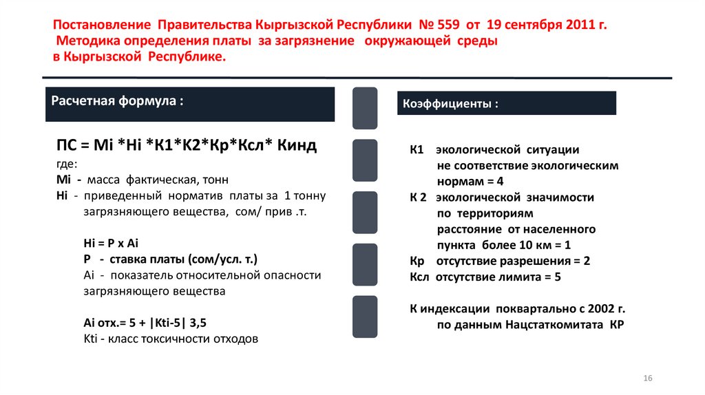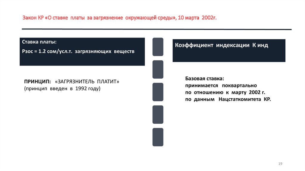 Закон КР «О ставке платы за загрязнение окружающей среды», 10 марта 2002г.Принята единая ставка Рзос = 1.2 сом/усл.т.