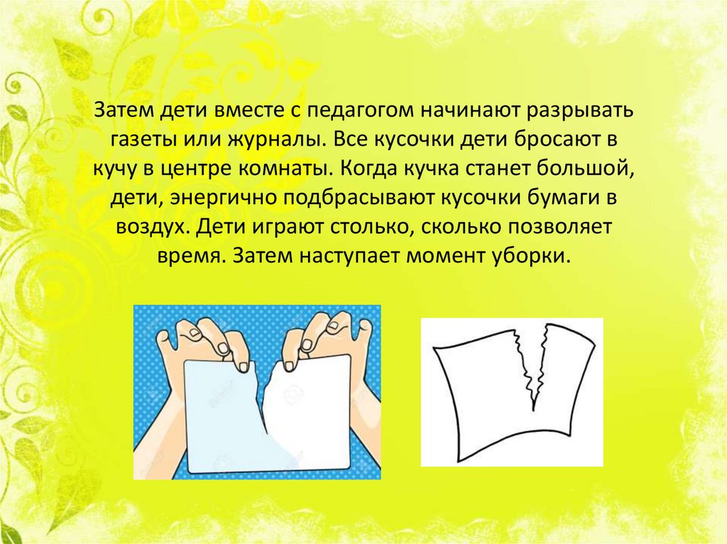 Затем дети вместе с педагогом начинают разрыватьгазеты или журналы. Все кусочки дети бросают в