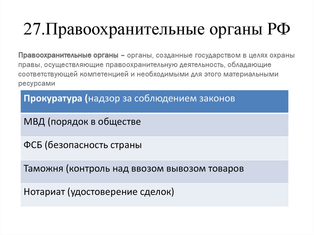 27.Правоохранительные органы РФПравоохранительные органы – органы, созданные государством в целях охраны
