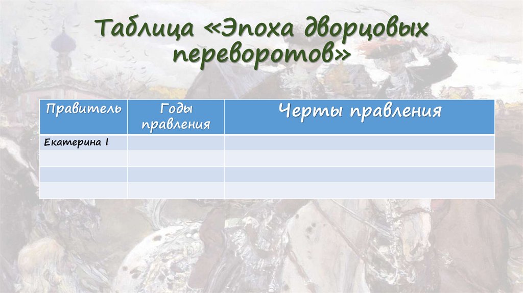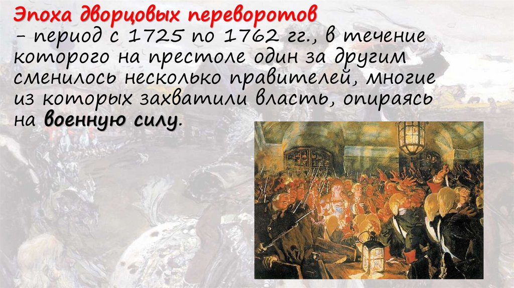 Эпоха дворцовых переворотов- период с 1725 по 1762 гг., в течение