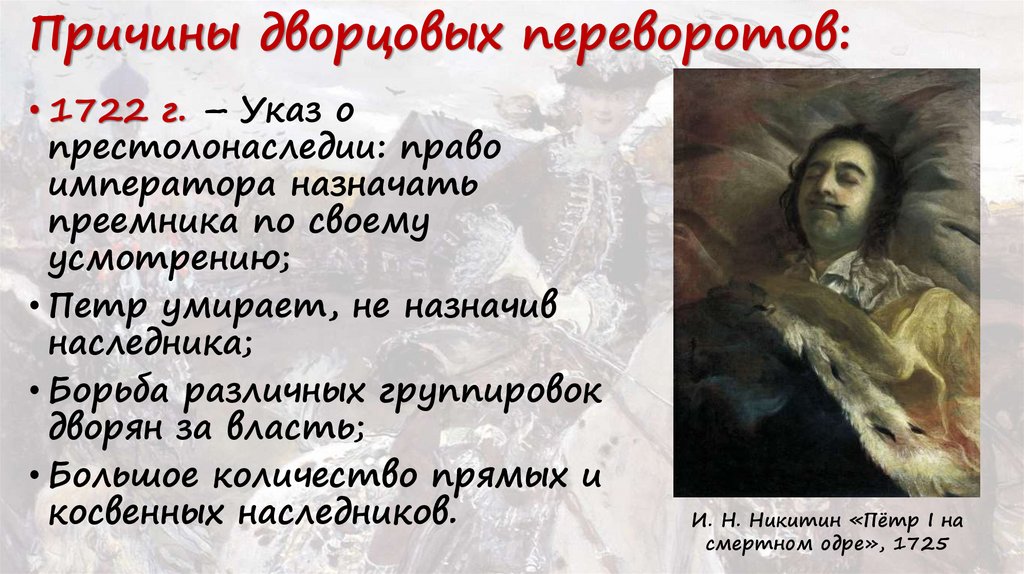 Причины дворцовых переворотов:• 1722 г. – Указ о