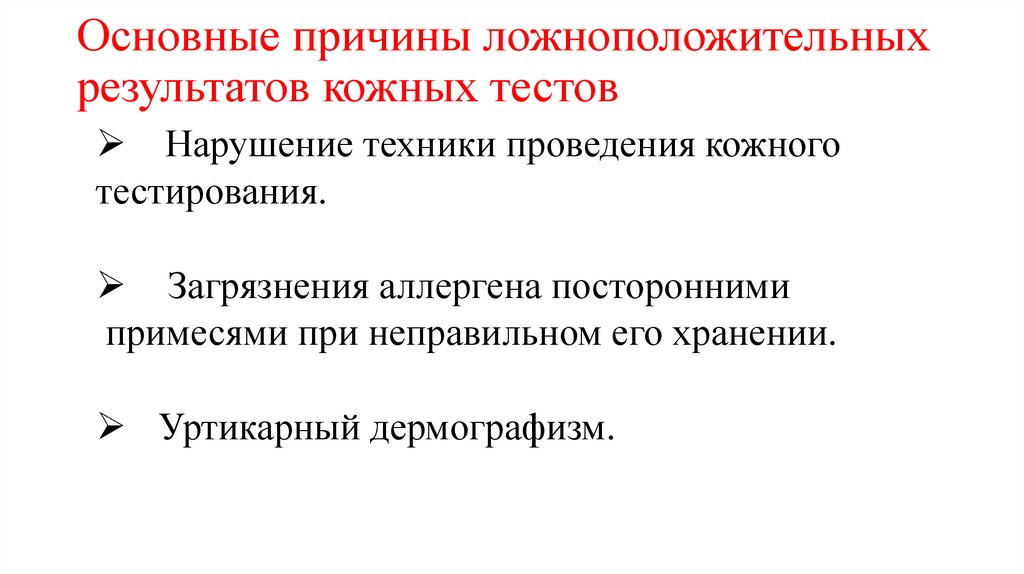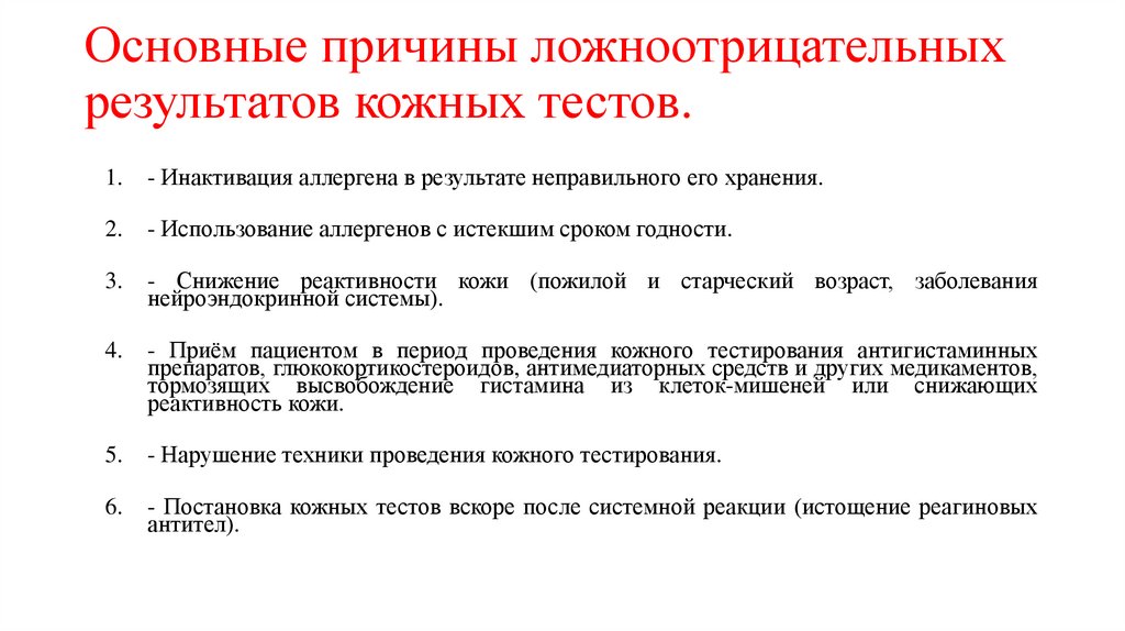 Основные причины ложноотрицательныхрезультатов кожных тестов.